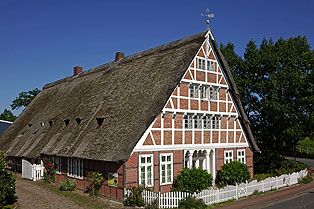 Bergfried 13; Altländer Hallenhaus mit aufwendiger Giebelgestaltung,