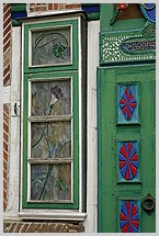 Schlagleiste, Simsleisten, untere Füllungen und Kämpfer mit Schnitzereien verziert,
