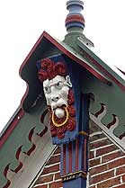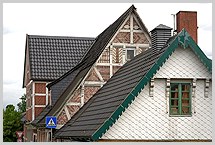 Pfannendeckung, Giebelkanten mit ausgesägten Ortbrettern, Giebelpfahl
