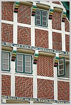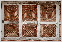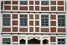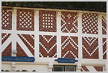 angestrichene) Fachwerkhölzer, Ziegelausfachung in aufwendiger