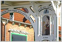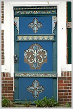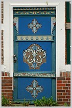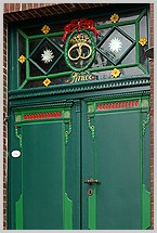 giebelseitig eine aufwendig gestaltete einflügelige Brauttür