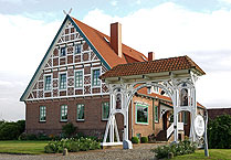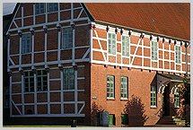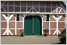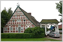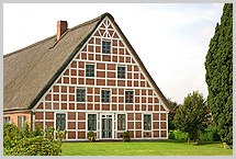 geweißten (mit weißer Farbe angestrichenen) Fachwerkhölzern und Ziegelausfachungen in Ziersetzung / Ziermauerung (sogenanntes "Buntmauerwerk"); Niederdeutsches Hallenhaus / Fachhallenhaus als Zweiständerbau