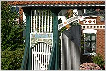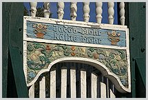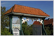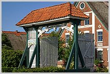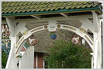gekreuzten Pferdekopf-Giebelbrettern als Giebelzier. Torgebinde mit