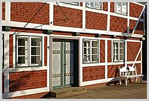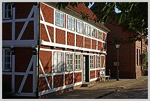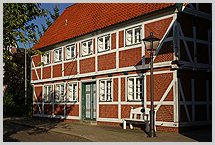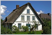 im Alten Land seltene Gebäudestellung. Fachwerkhölzer geweißt (mit weißer Farbe angestrichen), die Ziegelausfachungen