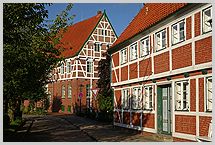 (Hofseite), eine im Alten Land seltene Gebäudestellung. Fachwerkhölzer geweißt (mit