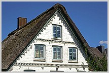 zweiflügelige Sprossenfenster; Satteldach mit Reetdeckung, Firstsicherung durch