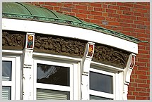 Fassadengliederung durch Lisenen, doppelte Sägezahnfriese und