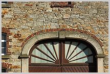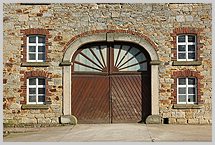 Ziegellaibung, Prellsteine und Bogen-Schlussstein aus Sandstein;