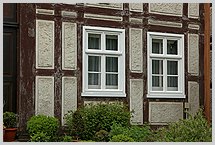 Sprossen; verputzte Ausfachung (neuzeitlicher Rauputz / Kratzputz); Fachwerk-Steilgiebel,