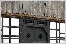 Torbalken (Torholm, Torsturz) und Winkelhölzer (Kopfstreben) tiefer gesetzt, der obere Dielenteil zu