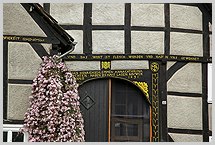 links jüngerer Anbau; Torgiebel in flächenbündiger Stockwerkbauweise mit sichtbaren Balkenköpfen,