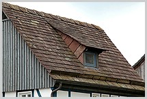 Satteldach mit alter Sollingplatten-Dachdeckung und Schneefangbohlen,