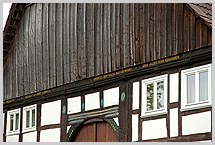 Zahnfries verzierte Füllhölzer zwischen den Balkenköpfen, senkrecht verbrettertes Giebeltrapez,