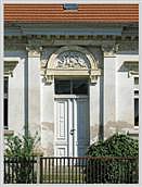 mit portalartiger Eingangsgestaltung (Pilaster, Gebälk), über der Tür ein Bogenfeld / Rundbogenfeld als