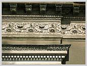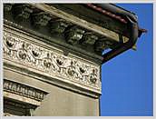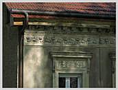 hohe Drempelzone mit Stuckfries, hölzernes Traufgesims (Traufkasten, mit Brettern verschalte