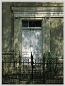 Zusammenfassung der Hauseingangstür mit einem Fenster unter einem Stuckgebälk auf kannelierten