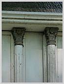 Dreiviertelsäulen gestaltet mit Kapitellen aus Zinkguss (?); profilierte Fensterrahmungen,