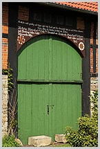 (Kriecher-Decker-Schalung); verziertes Rundbogen-Torgebinde, Torbalken (Torholm, Torsturz) mit eingeschnittener