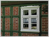 mit zwei Kübbungen (Abseiten), Rasterfachwerk des Wirtschaftsgiebels geweißt (mit weißer Farbe angestrichen), rote