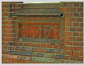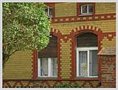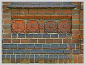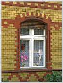 Bauernhaus um 1910, Ziegel-Terrakotta-Fassade, teils glasiert; Aufnahmedatum: 7.6.2007