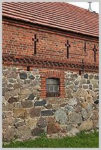 Nebengebäude zu einem Bauernhof, Ziegel-Fachwerk-Fassade mit Feldsteinsockel, 19.Jahrhundert;