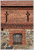 Kreuzverband, Ziegelfries (Sägezahn-Gurtfries) auf Deckenhöhe, Lüftungskreuze für den