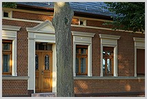 das rechte Nachbargebäude ein schlichter Sichtziegelbau mit hohem