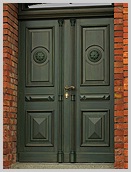 Pfostenattrappe; zweiflügelige Haustüren als Dreifüllungstüren mit zwei Schlagleisten,