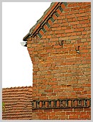 umlaufend eingesetzter Ziegelfries (Gurtfries als "Kreuzbandfries"),