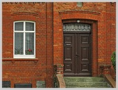 Ziegel-Sichtmauerwerk im Verband ausgeführt; Hauseingang zum Fenster