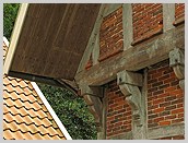 schlichter Ziegelausfachung, dreifach vorkragender Giebel auf profilierten