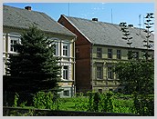 Bauernhäuser (Großbauernhäuser) mit Ziegel-Stuck-Fassade (links) und