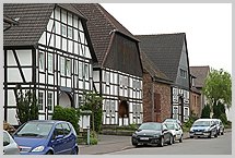 niederdeutsche Hallenhäuser als zweistöckige Fachwerkbauten auf