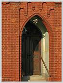 hervortretende portalartige Eingangsgestaltung mit eingezogener rundbogiger Türlaube;