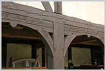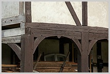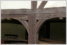 Ziegeldeckschicht; Ständer, Riegel und Streben gezapft, Streben auf Riegel geblattet;