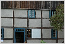 als Fachwerkbau in Stockwerkbauweise; niedriger Feldsteinsockel mit