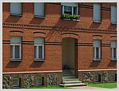 Straßenfassade aus Ziegel-Verblendmauerwerk, minimale Gestaltung durch teils