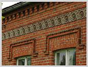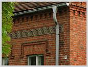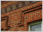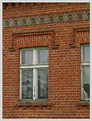 Zierformen, die gesamte Fassade offenbar saniert und sehr sorgfältig neu verfugt; Ziegelfries