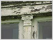 mit Stuckelementen für Tür- und Fensterfassungen, Traufe und Ortgang; offenbar noch