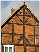 Fachwerkbau mit Langstreben (Schwelle-Rähm-Streben), Ziegelausfachung als Ersatz