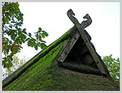 Reetdeckung, Rauchloch mit gekreuzten Pferdeköpfen als Giebelzier,