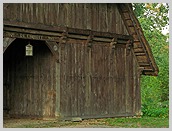 oder Bohlenstuben (nicht erkennbar, weil von außen mit Hartfaserplatten bekleidet); Umgebinde-Fachwerk