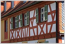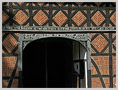 Fachwerk-Oberstock mit verschiedenen Verstrebungen (halbe "Mannfiguren",