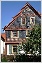 Dachgauben (Dachhäuschen) wohl später hinzugefügt; am Giebel