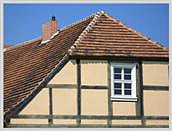 Krüppelwalmdach mit Biberschwanz-Doppeldeckung, breites Dachfenster ("Hecht"),