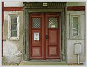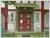 zweiflügelige Haustür mit Flügelverglasungen (zwei Füllungen ausgetauscht ?) zwischen Fachwerk-Türständern (echter "Türstock",