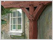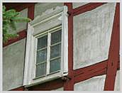 Fachwerkwand, später wurden die Hölzer ausgeschnitten und die Gefache ausgemauert; alte zweiflügelige Holzfenster