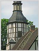 Ziegelausfachung und mehrfach gestufter und geschweifter Turmhaube, Turmspitze