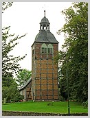 Ziegelbau komplett erneuert; Turmaufsatz aus Fachwerk mit geschweifter