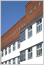 sowie dunklere Klinkerbänder. Diverse unterschiedliche Fensterformen, im